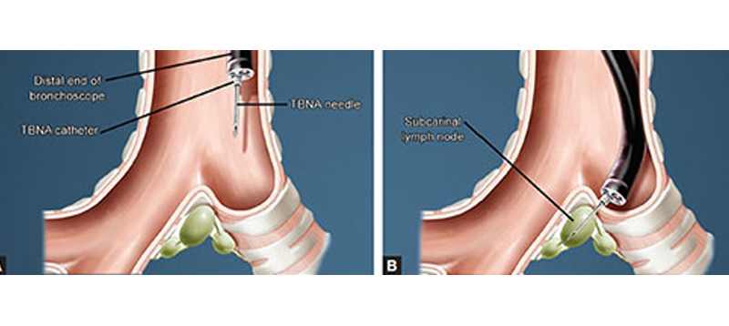 Transbronchial Needle Aspiration (TBNA) is a diagnostic procedure used to obtain tissue samples from the lungs or surrounding lymph nodes via a bronchoscope, a thin tube with a camera and a needle. It’s commonly performed to diagnose lung conditions such as infections, cancer, or sarcoidosis. The procedure involves inserting the bronchoscope into the airways and using a needle to aspirate (withdraw) tissue or fluid for analysis.